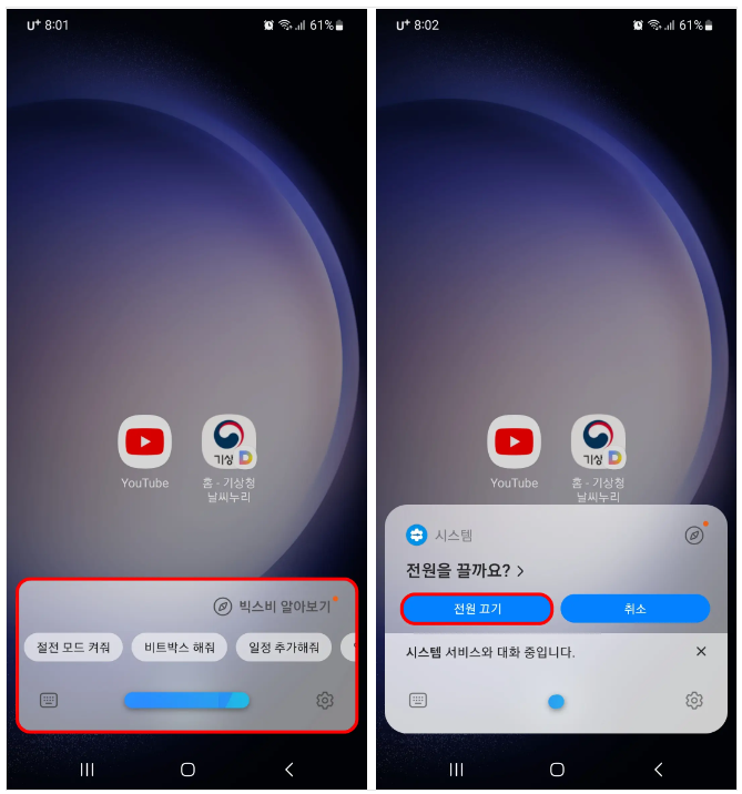 "하이 빅스비" 라고 빅스비를 호출한 뒤 "전원 꺼줘" 라고 말 하면 빅스비가 "전원을 끌까요?" 라고 응답을 합니다. 이때, "전원 끄기" 라고 말하거나 전원 끄기 버튼을 클릭하면 전원이 꺼집니다. 참고로 "하이 빅스비 전원 꺼줘" 라고 한 번에 말하셔도 전원이 꺼집니다.