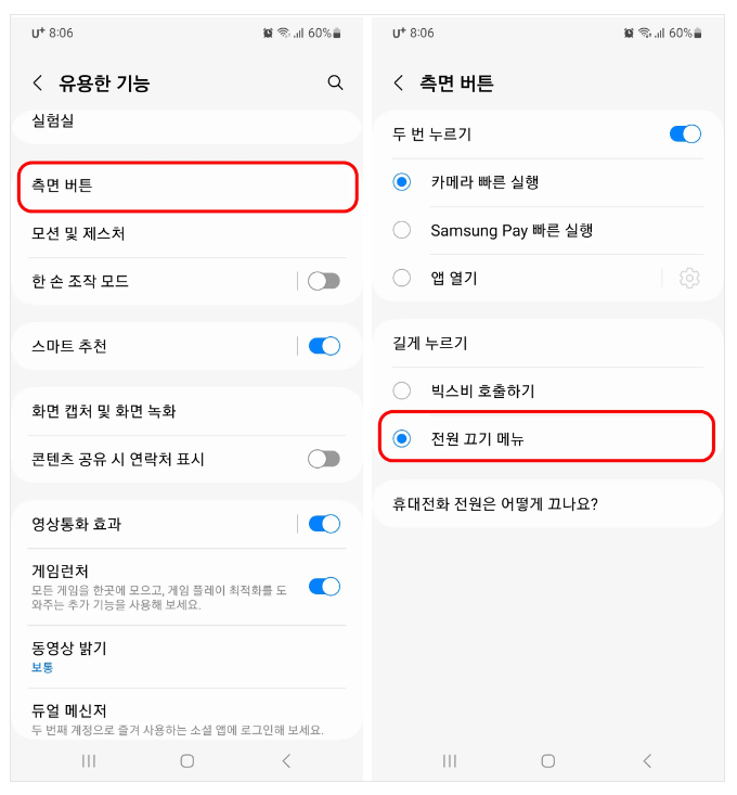 측면 버튼을 클릭한 뒤, 빅스비 호출하기로 설정 되어있는 것을 전원 끄기 메뉴로 바꾸면 저원 버튼을 길게 누르면 전원을 끌 수 있습니다.