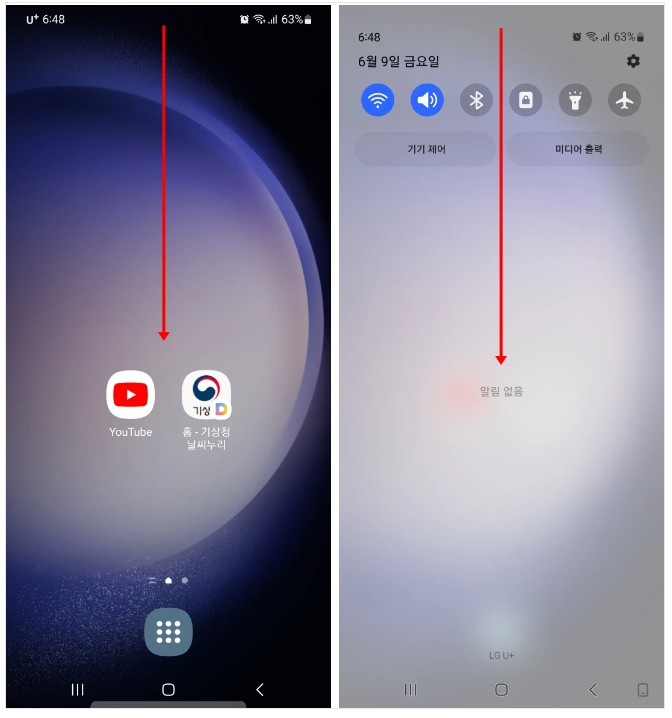 갤럭시 상단바를 아래로 내린 뒤, 한번 더 내립니다.