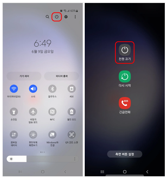 전원버튼과 볼륨버튼을 동시에 길게 누르면 하단과 같은 화면이 나타나며, 전원 끄기를 클릭하면 전원이 꺼집니다.