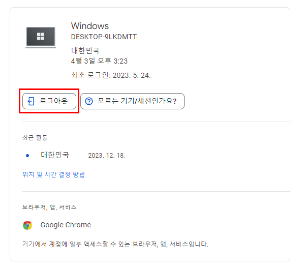 5) 내 구글 계정으로 접속되어 있는 모든 기기를 확인하실 수 있으며, 로그아웃을 할 수 있습니다.