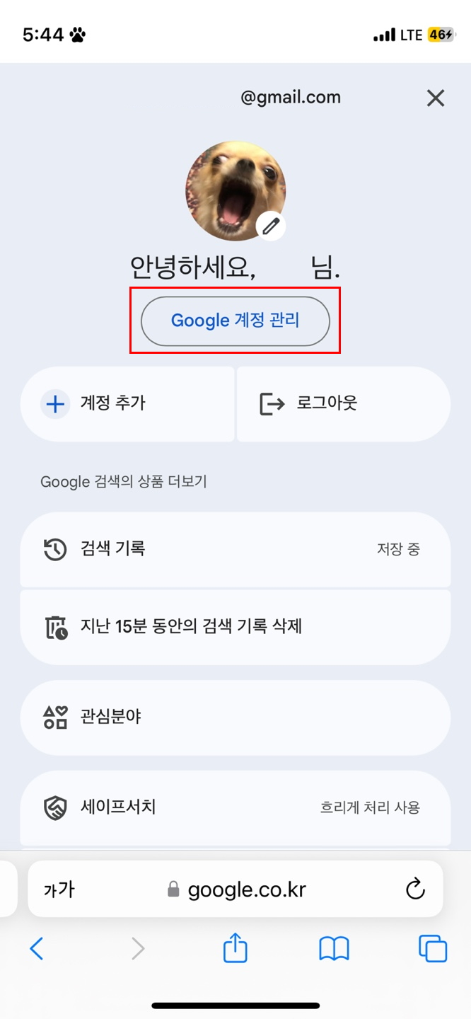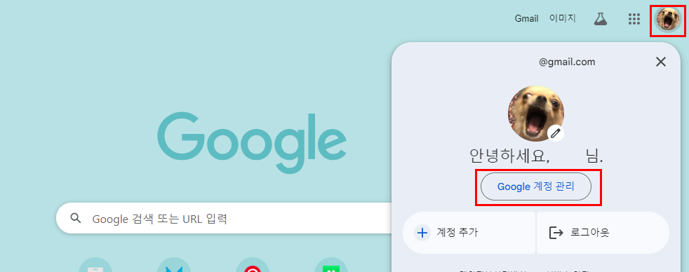2) 우측 상단의 프로필을 클릭한 뒤, 구글 계정관리 버튼을 클릭합니다.