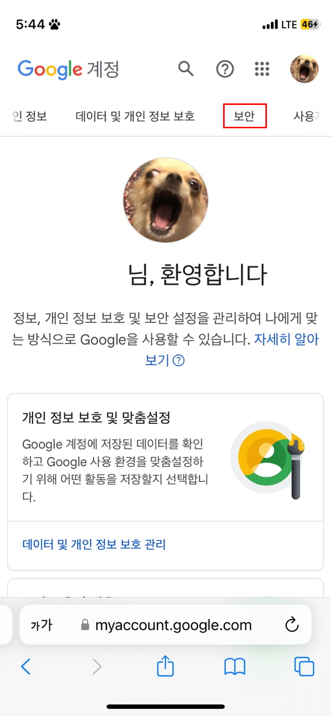 3) 계정 관리 메뉴에서 상단바를 우측으로 살짝 넘겨 보안 카테고리를 클릭합니다.