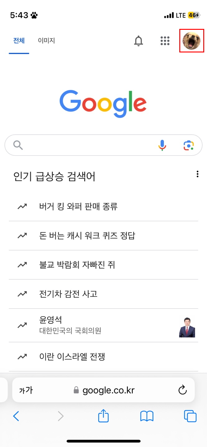 1) 구글 홈페이지 접속 후 우측 상단의 프로필을 클릭합니다.