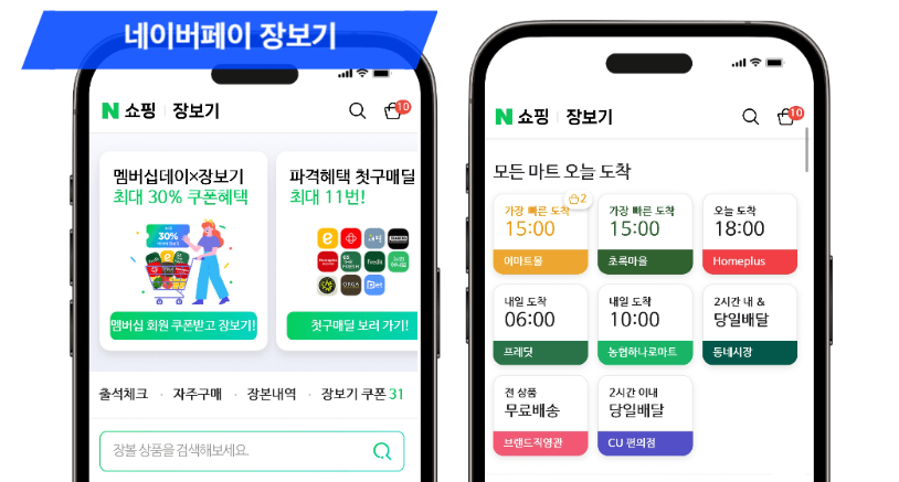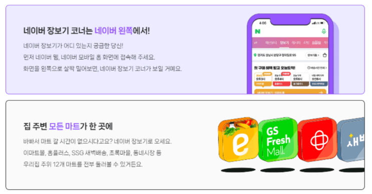 - 또는 네이버 모바일에서 화면을 왼쪽으로 밀어 ‘네이버 장보기’ 누르기