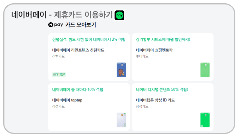 네이버페이 제휴카드를 이용한다면, 실적에 따라 최대 3% 포인트 적립이 가능합니다. 체크카드와 신용카드 등 혜택이 다양하니, 꼭 비교해 보시고 카드를 이용하시기를 바랍니다.