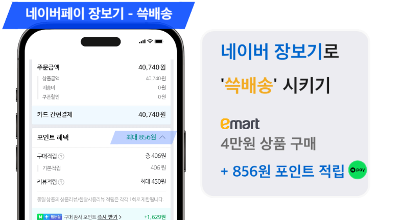하단의 사진은 이마트를 네이버페이로 이용하였을 때 화면입니다. 이처럼 주문 금액이 4만 원일 때, 포인트로 856원을 적립 받을 수 있습니다.