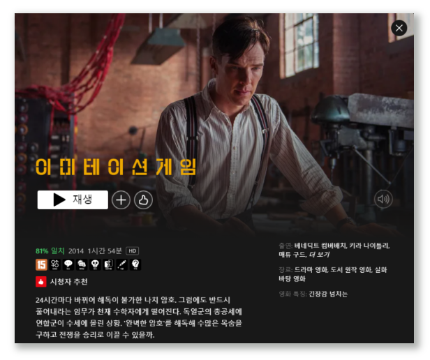 이미테이션 게임은 수학 천재 주인공과 그의 동료들이 독일 나치의 암호를 해독하기 위해 노력하며 헤쳐나가는 스토리를 담고 있습니다. 주인공은 에니그마 기계를 해독하고, 나치의 비밀 통신을 해독하는것에 성공하며 제2차 세계 대전에 큰 영향을 미치게 하는 흥미진진하고 심장 쫄깃한 영화입니다. 24시간마다 암호가 바뀌기 때문에 더욱 흥미진진하며, 베네딕트 컴버배치가 출연해 더 몰입하면서 시청이 가능합니다.