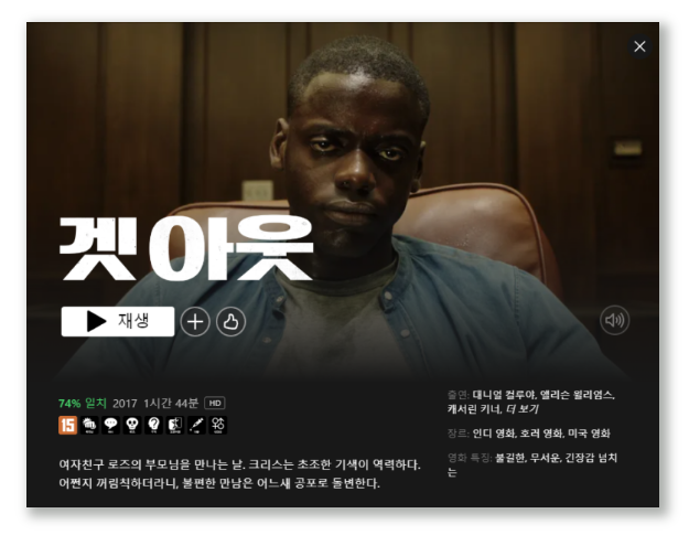 겟 아웃은 미국의 인디 호러 영화입니다. 잔인하거나 깜짝 놀래키는 장면 없이 신선하게 무서운것이 특징입니다. 겟 아웃의 줄거리는 주인공이 휴가로 시골에 방문하게 되는데, 그 곳에서 벌어지는 이상한 일들을 마주하면서 여자친구 부모님 집에 방문을 하며, 그곳에서 미스터리하고 소름돋는 사건을 마주하게 됩니다. 조금씩 진실이 드러나며 주인공은 더 이상 탈출할 수 없는 공포의 미로에 갇히게 되는 심리적 공포가 강한 영화입니다. 겟 아웃은 인종, 사회적 편견, 무서운 마음을 다루는 심리적 긴장감으로 몰입도가 강한 작품입니다.