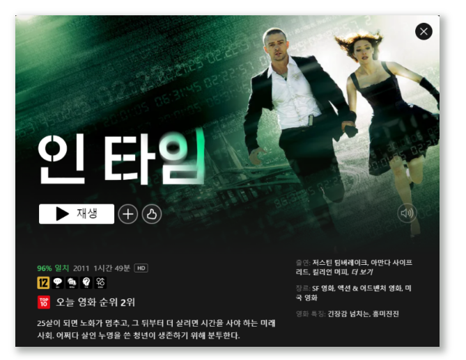 2011년 10월에 개봉된 SF 영화로, 오펜하이머의 킬리언 머피 배우가 출연하며, 인 타임의 세계관은 돈은 존재하지 않고 오로지 시간으로 대체되는 심오한 내용입니다. 인 타임은 미래 사회에서 시간이 통화로 거래되고, 시간이 부족한 하층민과 부자 사이의 격치를 다루는 영화입니다. 주인공은 시간을 뺏기고 빼앗으며 생사가 갈리는데, 부자들의 세계로 뛰어들어 이 세계를 바꾸고자 하는 흥미진진한 스토리가 펼쳐집니다.