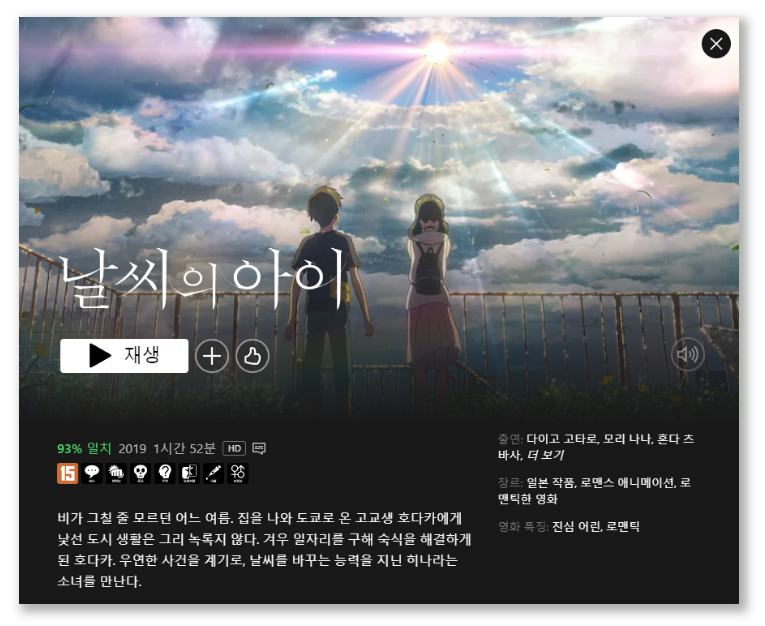 날씨의 아이는 영화 너의 이름은 감독으로 유명한 신카이 마코토 감독의 영화입니다. 남자 주인공과 여자 주인공은 서로 하늘에서 비와 눈을 내리게 할 수 있는 특별한 능력을 지니고 있으며, 우연히 만나게 된 이들은 서로의 능력을 알게 됩니다. 하지만 서로의 능력으로 인해 자신과 주변 사람들에게 어떤 영향을 끼치는지 깨닫게 되고 그로 인한 어려움과 갈등을 겪고 풀어내는 이야기입니다. 일본 애니메이션의 영화이며, 로맨틱하고 주인공등의 진심어린 사랑이 돋보이는 영화입니다.