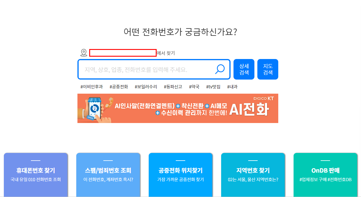 하단의 사이트 바로가기를 클릭하시면 KT 114 페이지로 이동 됩니다. 다양한 형태의 전화번호를 검색 할 수 있으며, 휴대폰 번호 외에도 지역번호를 포함한 일반 가정 및 회사 전화번호 등으로 모르는 전화가 왔을때도 검색이 가능합니다.