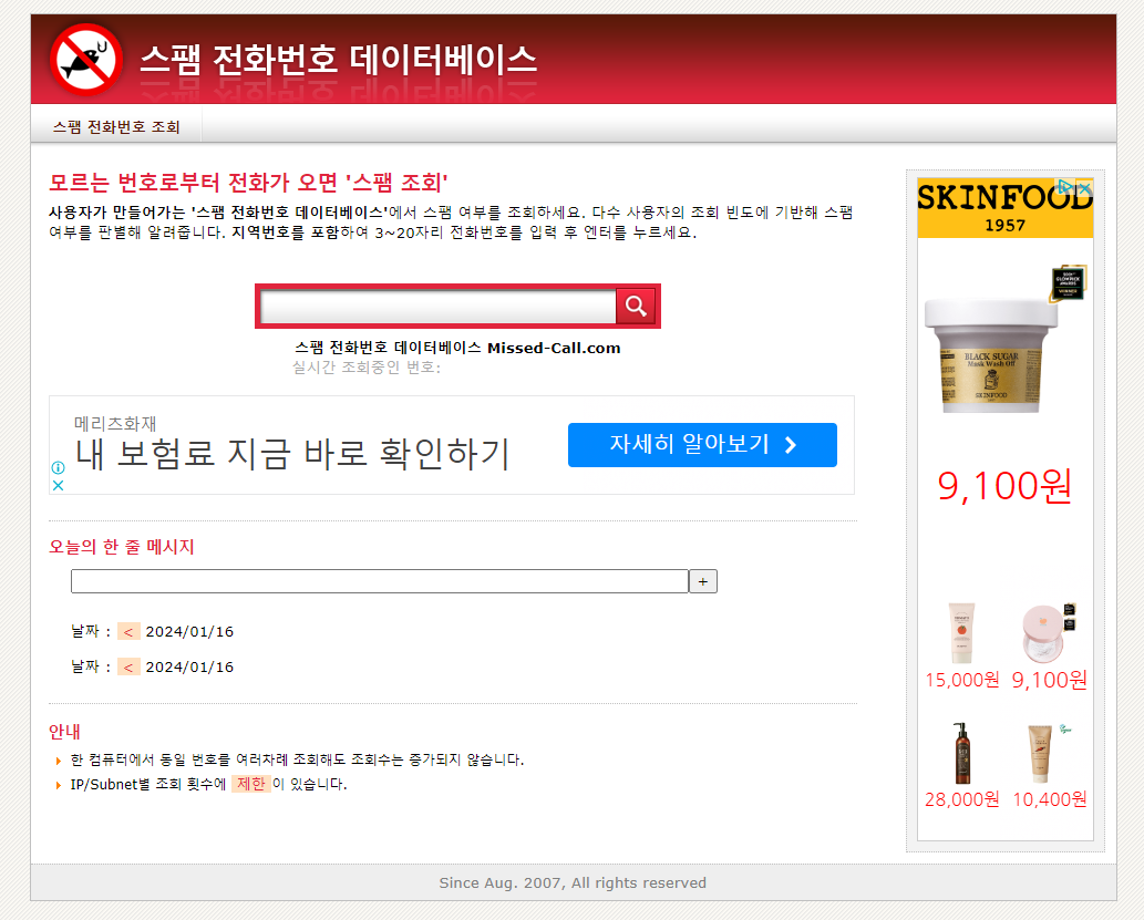하단의 사이트 바로가기를 클릭하시면 데이터베이스 페이지로 이동 됩니다. 데이터베이스는 테이터베이스를 이용하는 사용자들이 만들어가는 사이트입니다. 다수 사용자의 조회 빈도 기반으로 스팸 여부를 판별 합니다.