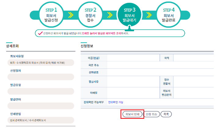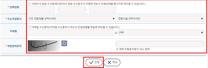 5) 전화번호 및 주소지 경찰서, 자동입력방지 입력 후 신청하기 버튼을 클릭합니다.
