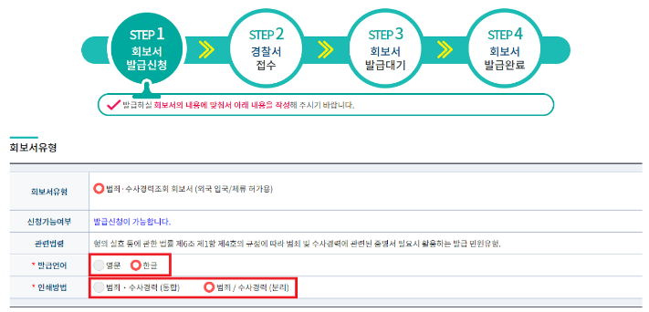 3) 발급언어 및 인쇄방법을 선택합니다. 범죄 • 수사 경력을 통합 및 분리해 인쇄가 가능합니다.