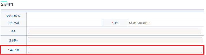 4) 기본정보 확인 후 발급사유를 입력합니다.