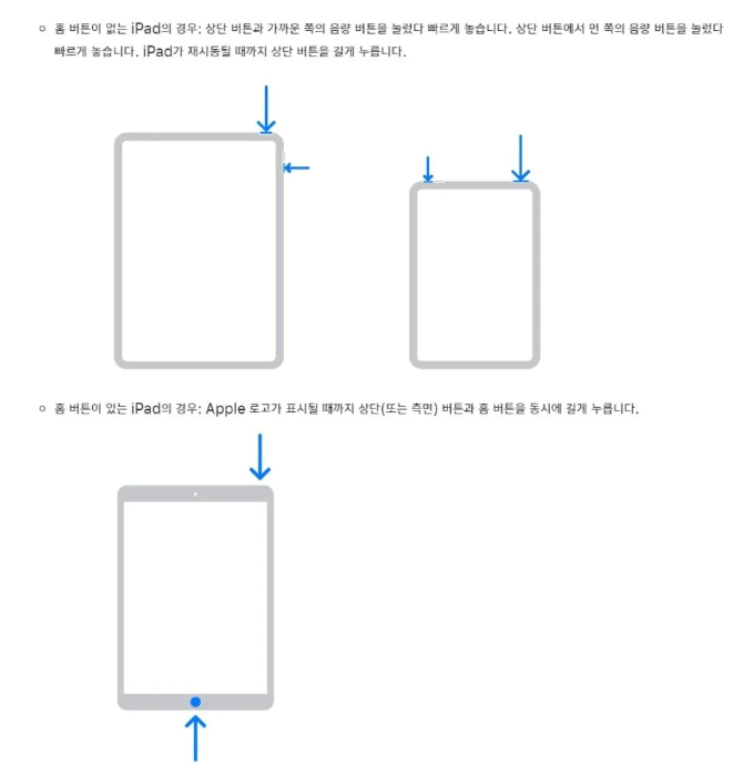 아이패드 재부팅을 해도 충전이 되지 않는다면 아이패드를 강제로 재부팅 하셔야 합니다. 하단의 이미지를 통해 따라 해 보아도 충전이 되지 않는다면 고객센터에 방문 하시는것을 추천드립니다.