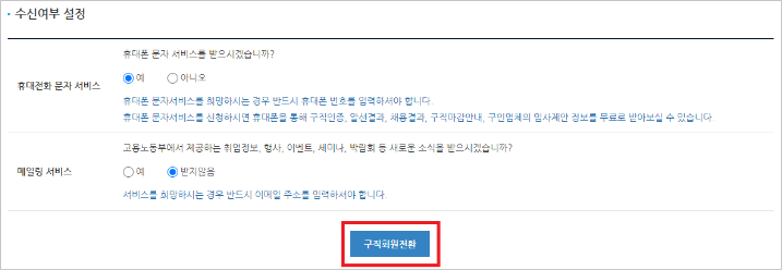 5) 휴대폰 문자 서비스 / 메일링 서비스 수신여부 확인 후 구직회원전환 버튼을 클릭합니다.