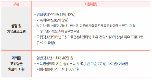 - 학령전환기 청소년(초 4, 중1, 고1) 대상 인터넷·스마트폰 과의존 상담, 치유 등 지원