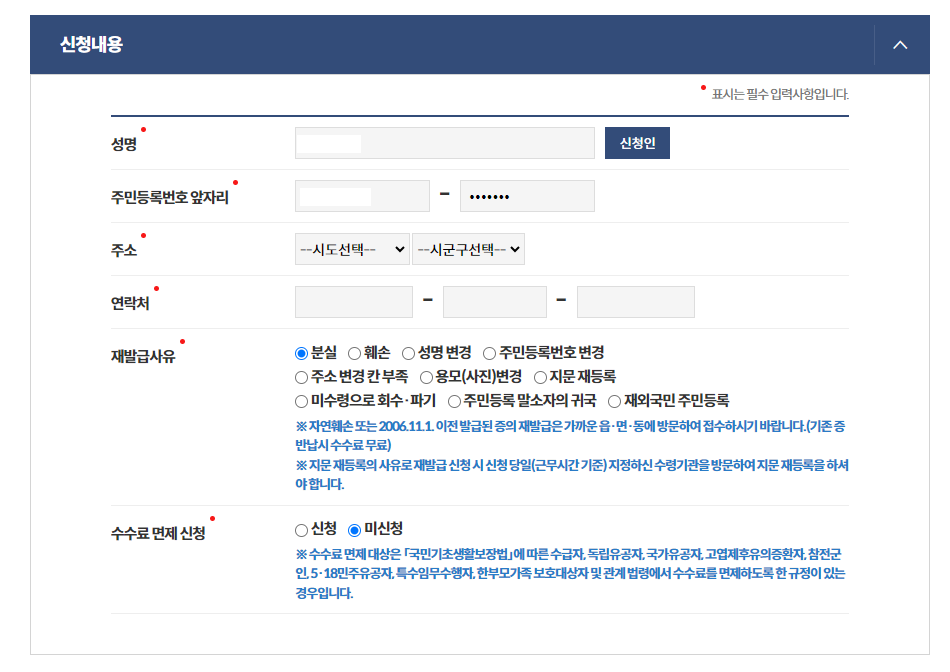 3) 주소, 연락처, 재발급 사유를 선택 및 입력합니다.