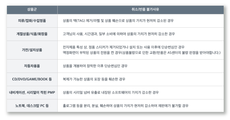 취소 및 반품이 불가한 사유 중 대표적인 사유는 하단과 같으며, 그 외의 경우는 사진을 참고해주시길 바랍니다.