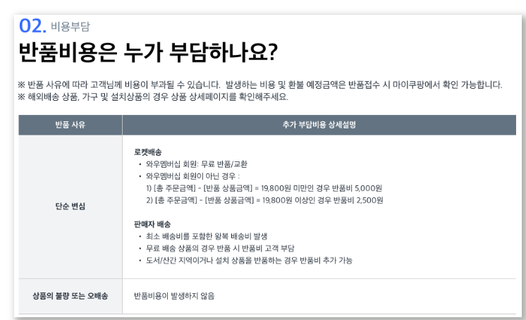 환불비용도 2가지로 나뉘며, 로켓 와우 회원의 경우 환불 시 따로 청구되는 비용이 없습니다.