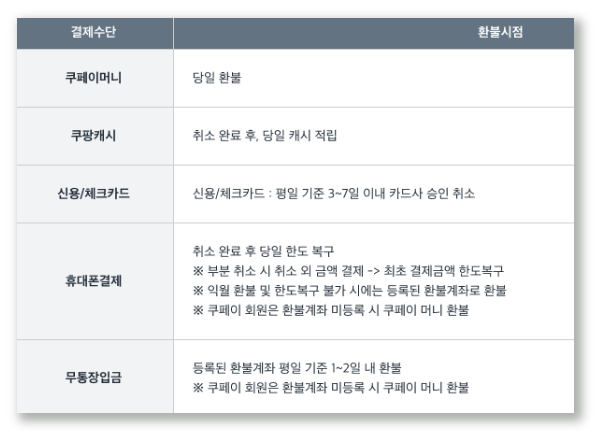 환불이 완료되는 기간은 결제수단에 따라 달라지게 되며, 하단과 같습니다.